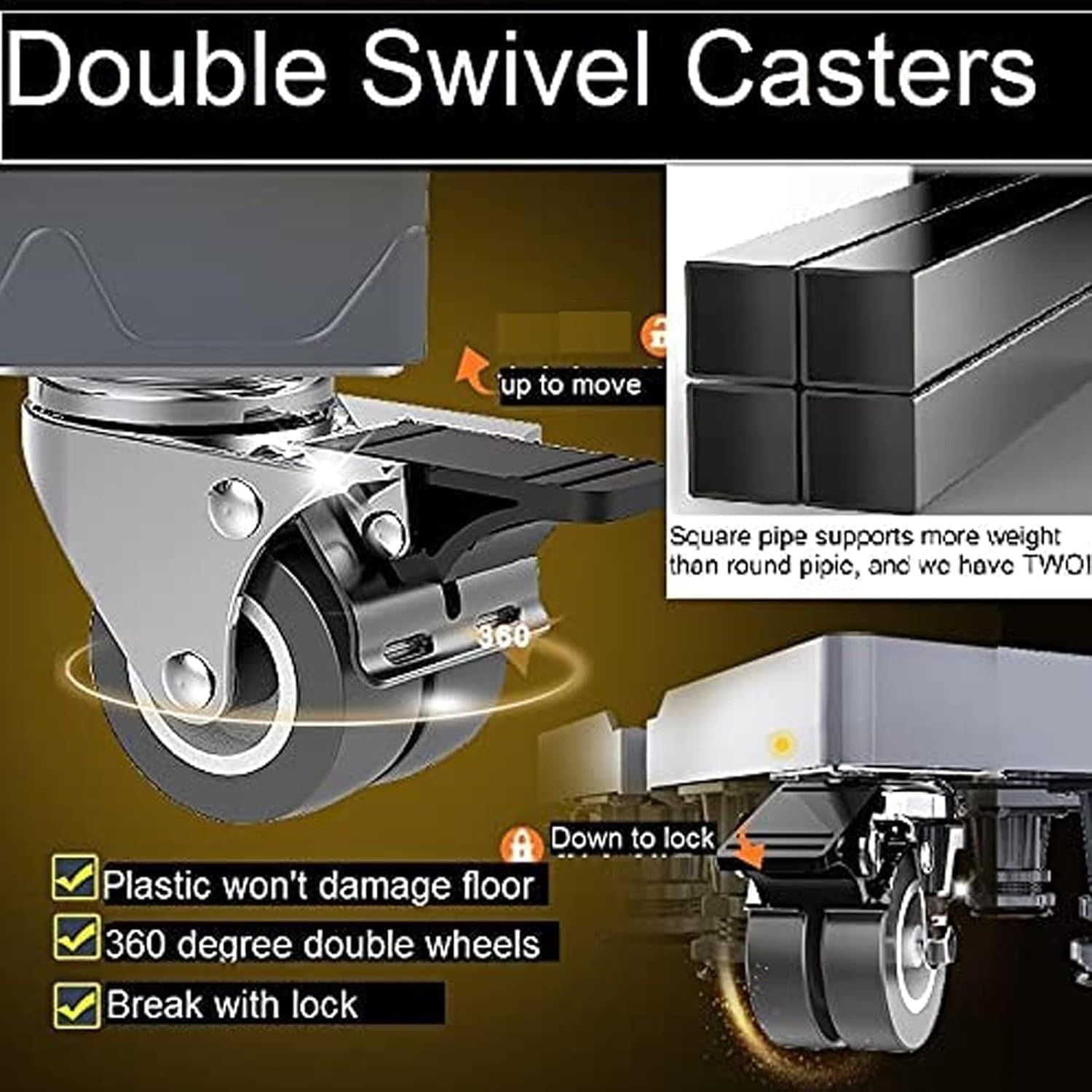 Assembly takes just minutes — no tools required. Simply connect the tubes, adjust the width, and secure the locks. The 4 double swivel casters rotate 360° for effortless mobility, and each wheel features a locking mechanism to keep your appliance securely in place.